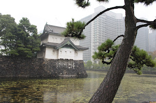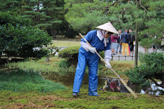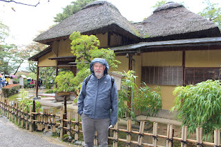Kenrokuen is a major tourist attraction, so the advice is to get there early. It opens at eight, and we were there not long after. Despite some rain, the first we had encountered in Japan, there were a good many people around first thing. Kenrokuen, which was originally the private garden of the feudal ruling family - which is why it adjoins the castle - is huge, varied and beautiful, with something to catch the interest at every turn. According to Japan Guide, "Kenrokuen literally means 'Garden of the Six Sublimities', referring to spaciousness, seclusion, artificiality, antiquity, abundant water and broad views, which according to Chinese landscape theory are the six essential attributes that make up a perfect garden." Even through a rather persistent drizzle, it was difficult not to be impressed by the trees, the plants, the fountains, the lake... Here's the obligatory Brit in raingear shot: