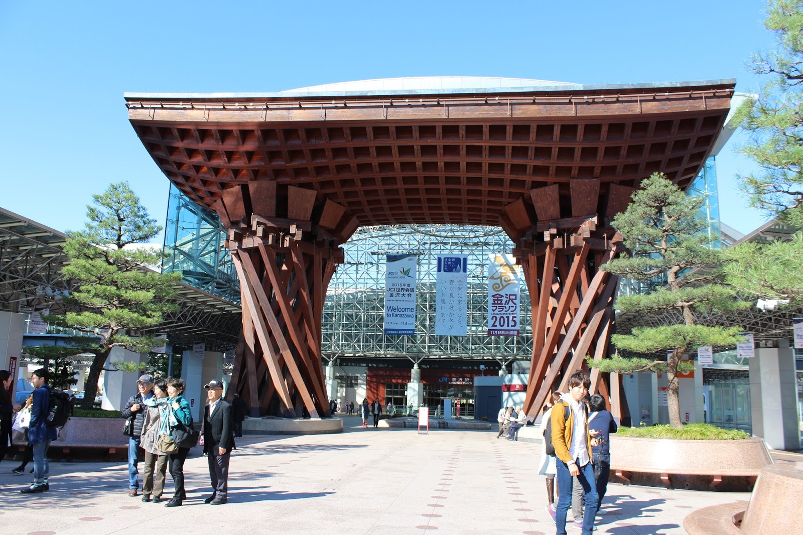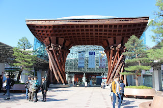 Kanazawa railway station is quite something. After the Shinkansen glided in, coming to a stop at precisely the correct second, we were soon able to see its bold modern design, dominated by the Tsuzumi-mon gate, shaped like the traditional Japanese drums, but also, we thought, reminiscent of a temple gateway.