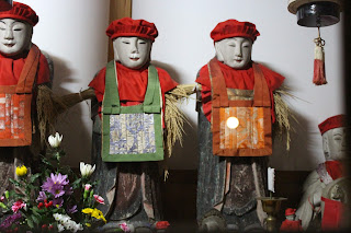 Back in Kamakura, we took a local bus out to the Hokokuji temple, which is remarkable for its bamboo grove. A little path takes you around the temple and into the cool and quiet of the bamboo, and you can also admire the gravel gardens, very like the ones we saw on the Philosopher's path in Kyoto. In an area we couldn't access, some caves contained a little army of figurines.